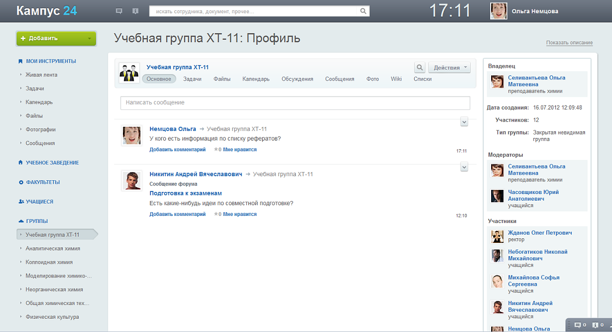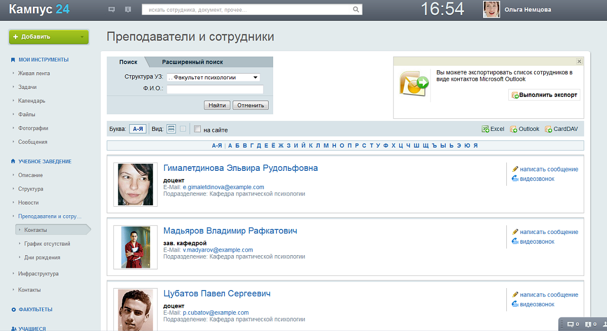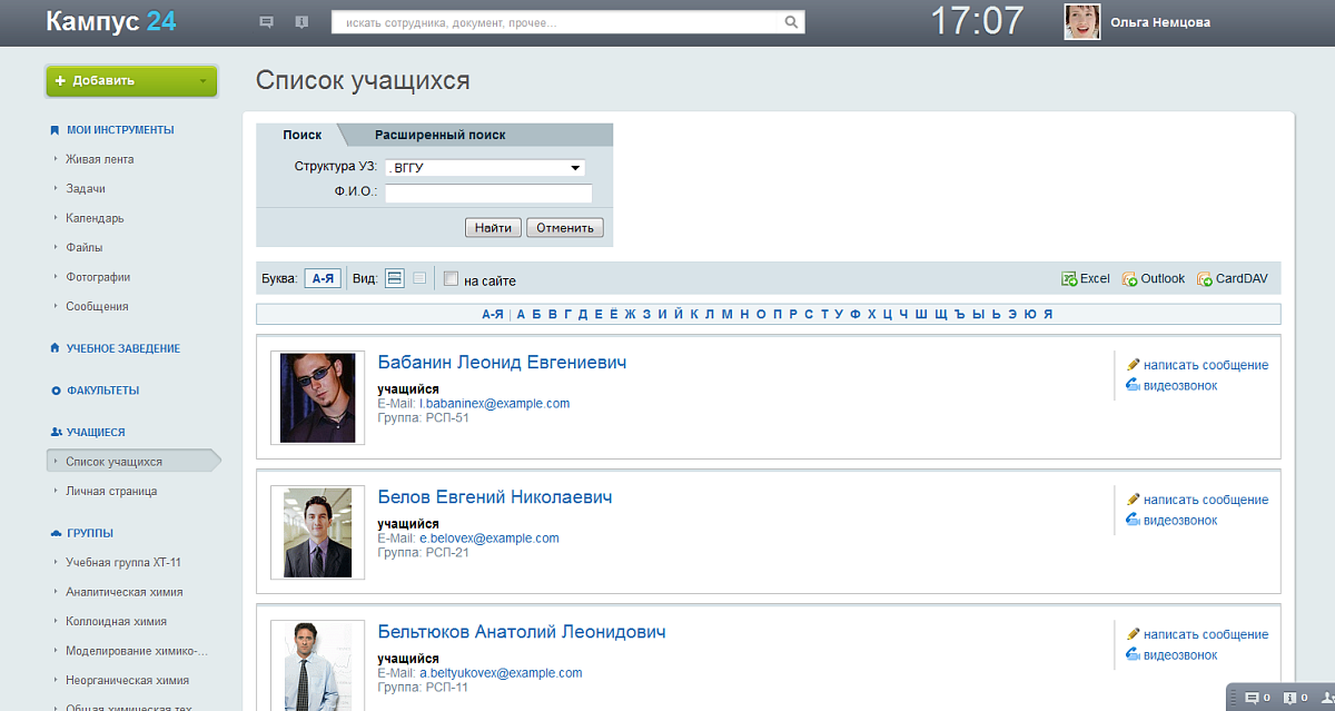 - Найти людей в социальной сети учебного заведения (преподаватели, одногруппники, другие учащиеся, выпускники), посмотреть контактную информацию, отправить сообщение