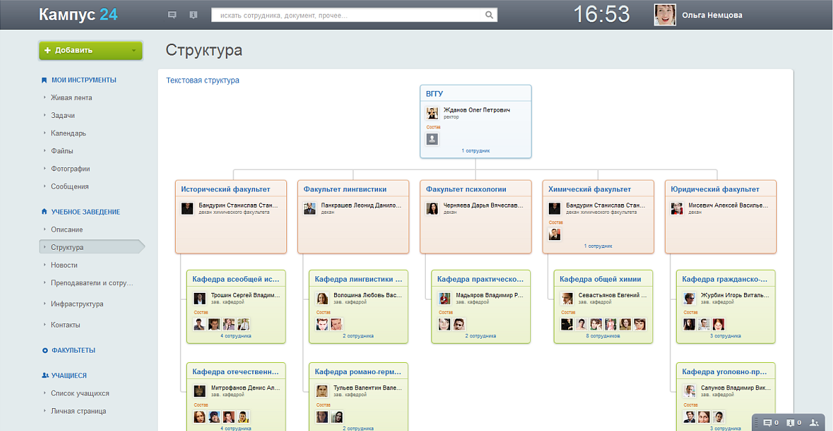 Учебный процесс:- Посмотреть структуру учебного заведения (факультеты/кафедры/администрация), информацию о ключевых персонах;