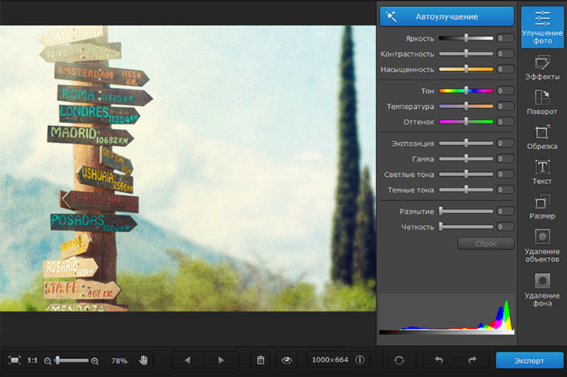 Фотография вышла недостаточно яркой и сочной? Это легко исправить при помощи авто-фильтра «Улучшить изображение». Всего одним нажатием кнопки вы можете выставить оптимальный контраст, яркость и баланс белого, и для этого не нужно знать ничего о параметрах изображения – программа сама определит необходимые значения. - Удаление объектов с фото