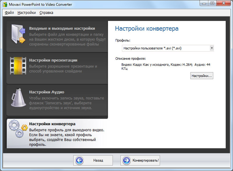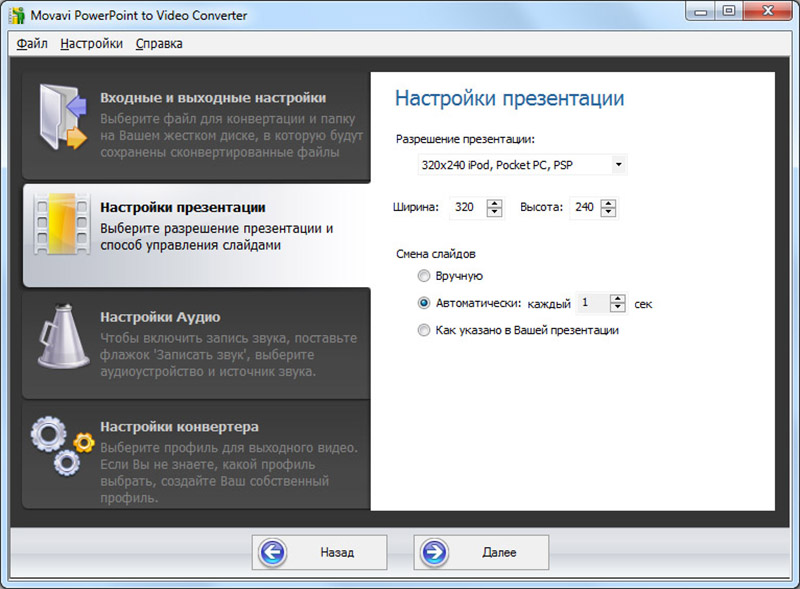 Мы сделали программу для конвертации презентаций в видео максимально удобной и интуитивно понятной. Настраивайте синхронизацию, продолжительность отображения слайда, параметры видеофайла на выходе и многое другое всего за пару кликов. Также вы можете сохранить исходные настройки своей ppt-презентации и конвертировать её без изменений.